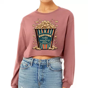 Popcorn Cropped Long Sleeve T-Shirt – Funny Design Women’s T-Shirt – Printed Long Sleeve Tee