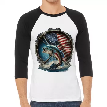 Flag Behind Bass Fishing Baseball T-Shirt – Patriotic T-Shirt – Cool Baseball Tee