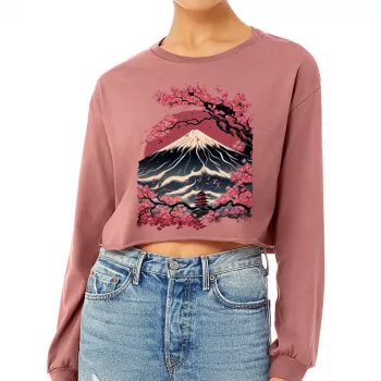 Japan Art Cropped Long Sleeve T-Shirt – Blossom Women’s T-Shirt – Landscape Long Sleeve Tee