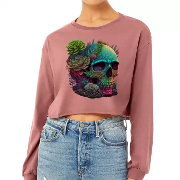 Skull Graphic Cropped Long Sleeve T-Shirt – Gothic Women’s T-Shirt – Cool Art Long Sleeve Tee